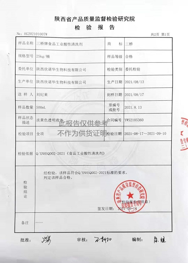 三橋牌食品工業(yè)酸性清洗劑(XNHSQ-2型)檢測(cè)報(bào)告