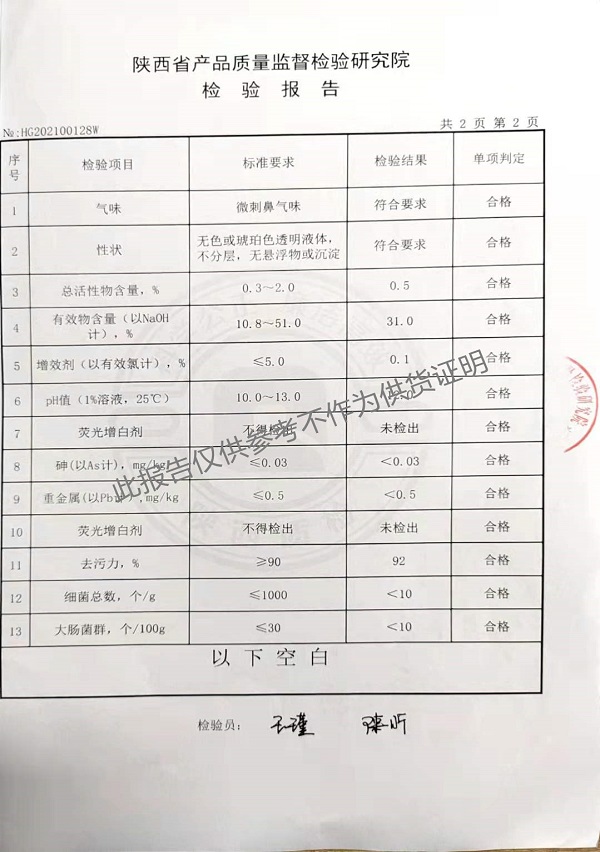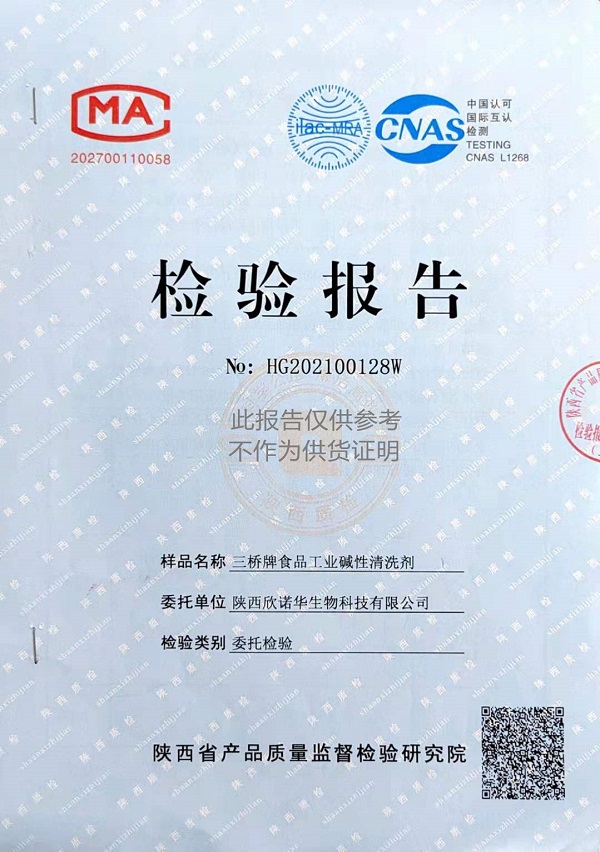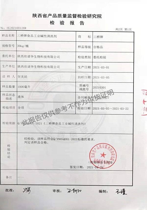 三橋牌食品工業(yè)堿性清洗劑(XNHSQ-1型)檢測報告(2021年度)-陜西欣諾華生物科技有限公司