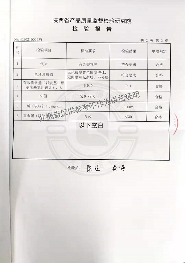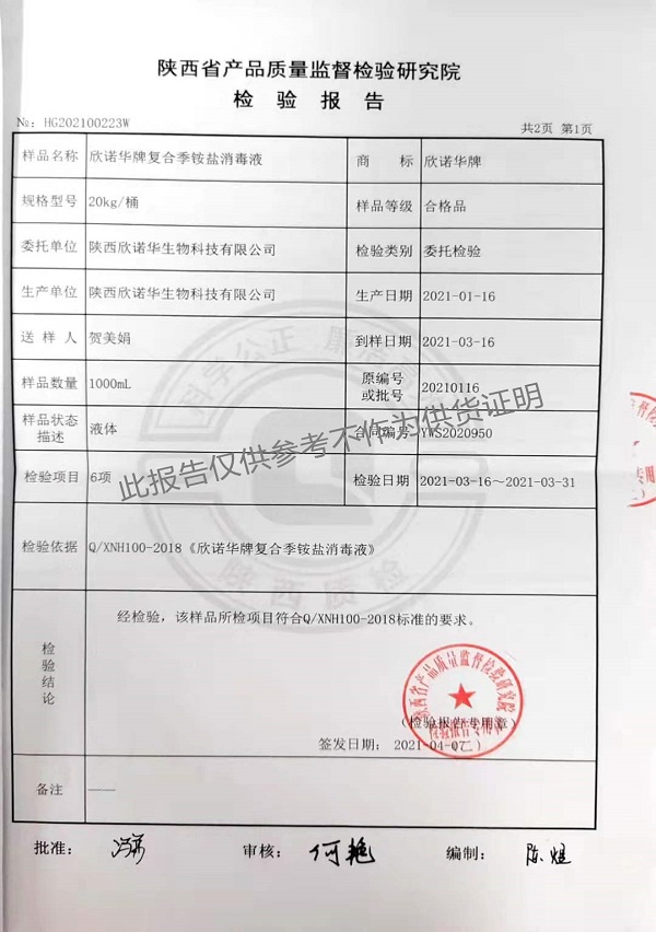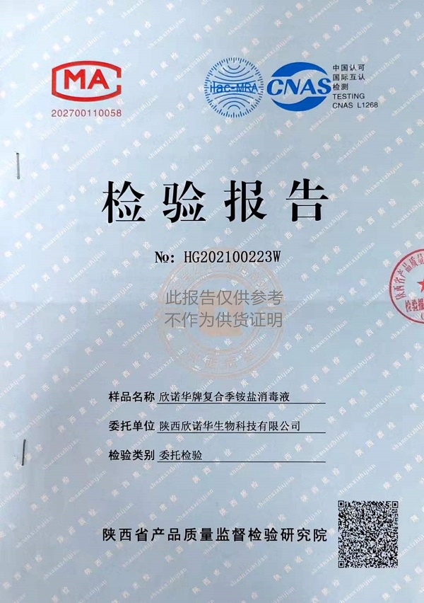 欣諾華牌復(fù)合季銨鹽消毒液(XNH100型)檢測報告(2021年度)-陜西欣諾華生物科技有限公司
