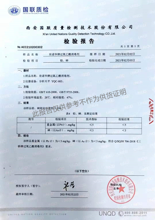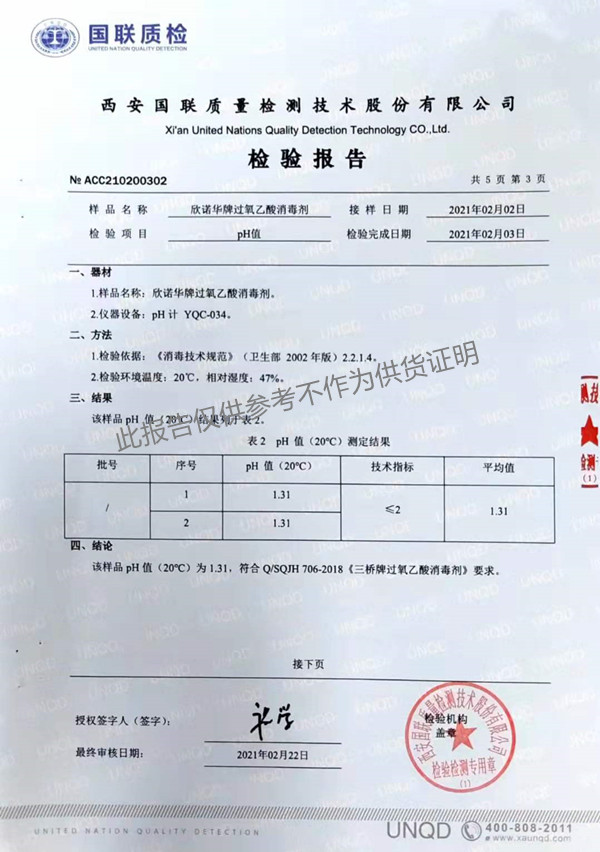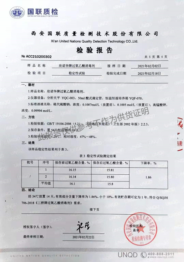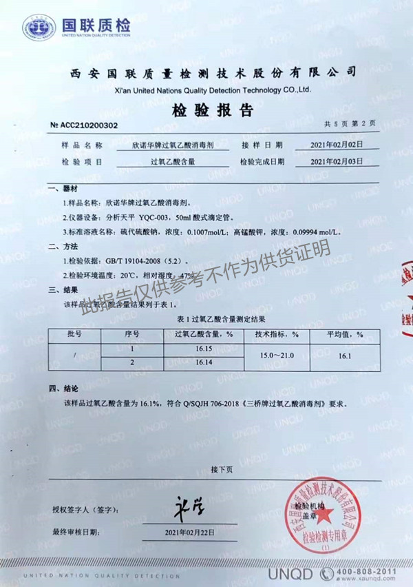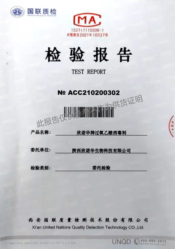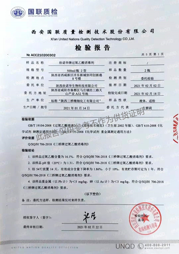 欣諾華牌過氧乙酸消毒劑(SQ-706型)檢測報(bào)告(2021年度)-陜西欣諾華生物科技有限公司