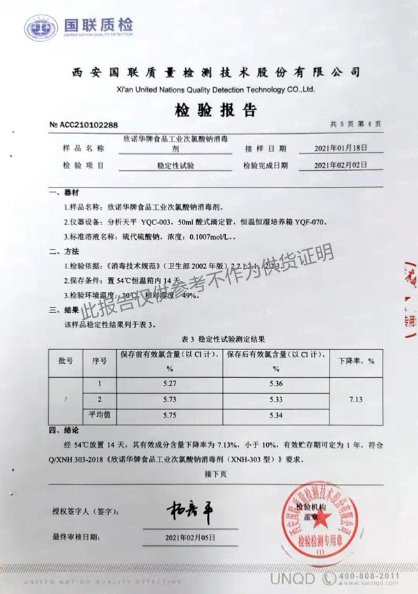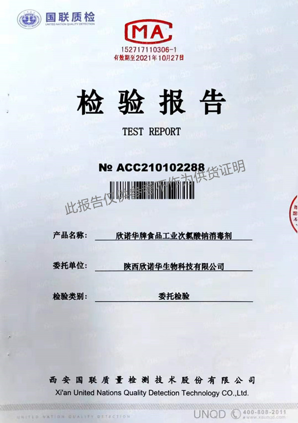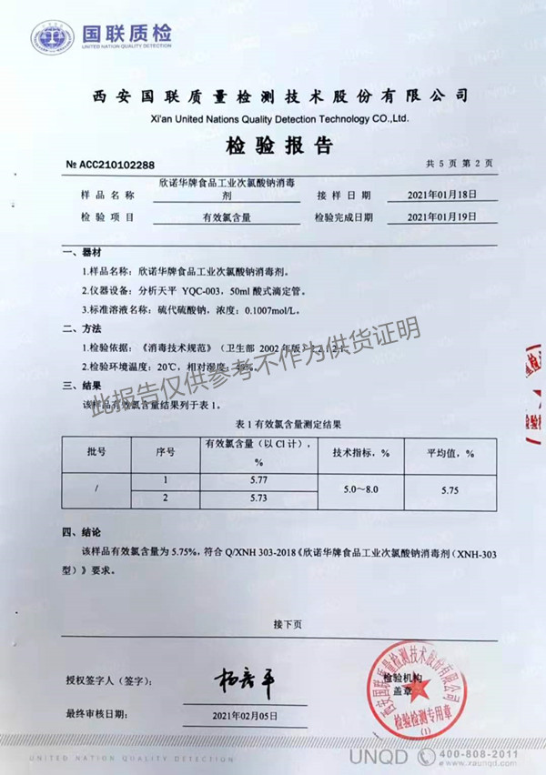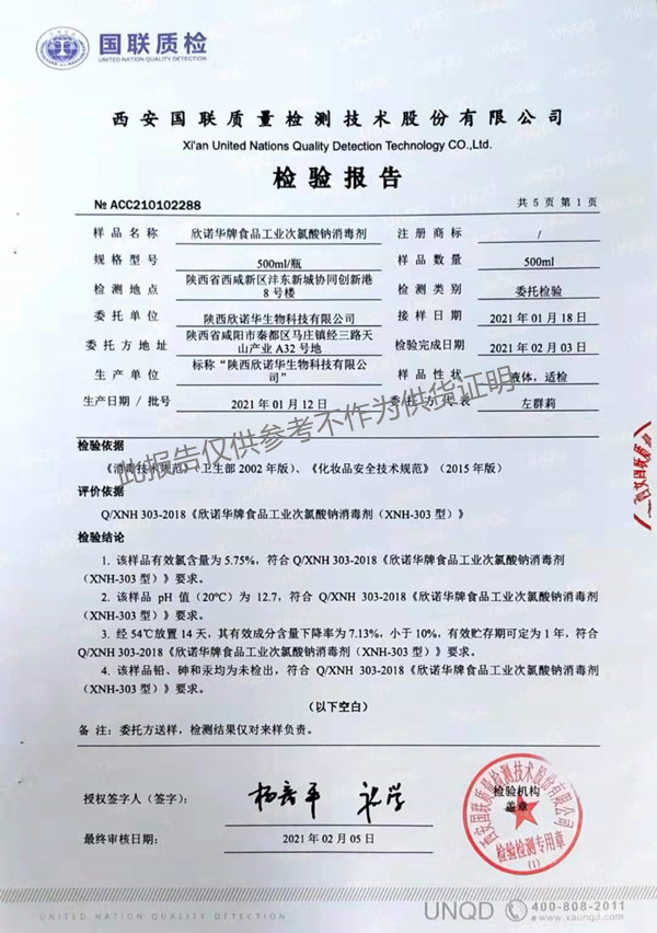 欣諾華牌食品級(jí)次氯酸鈉消毒劑檢測(cè)報(bào)告(XNH303型)(2021年度)-陜西欣諾華生物科技有限公司