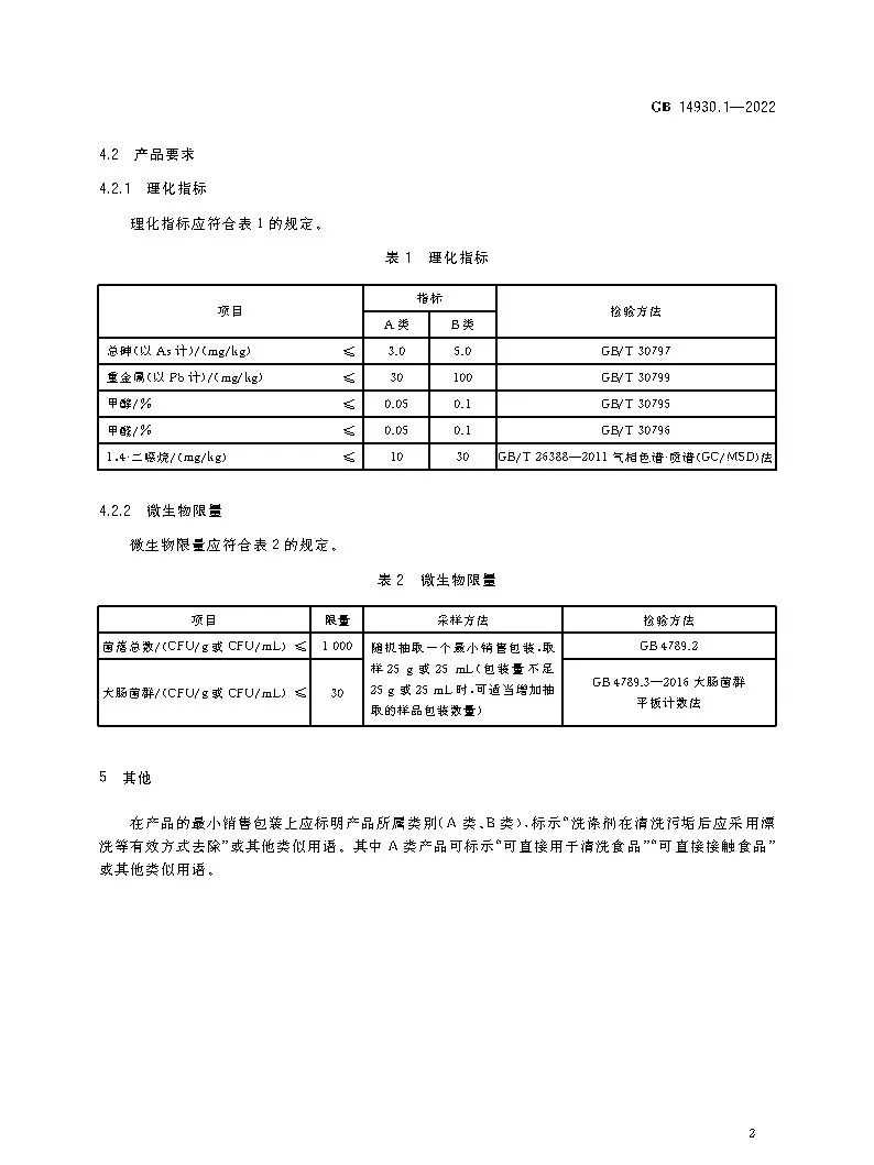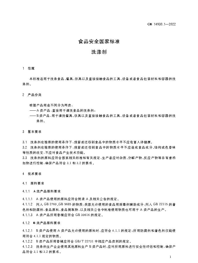 GB 14930.1-2022 食品安全國家標準 洗滌劑介紹:和2015版區(qū)別:增加了二惡烷的指標,修改了產品標識等六項不同。