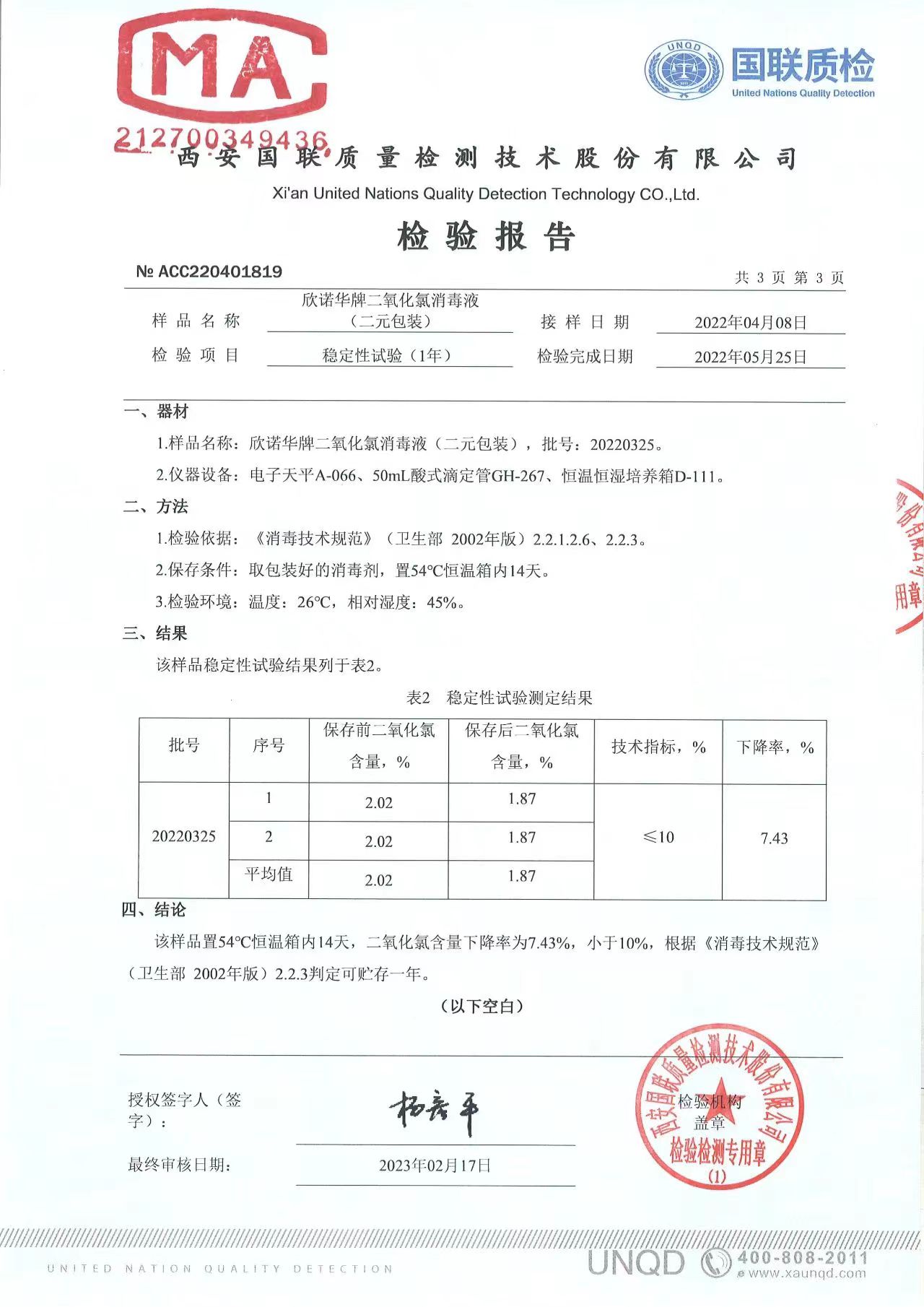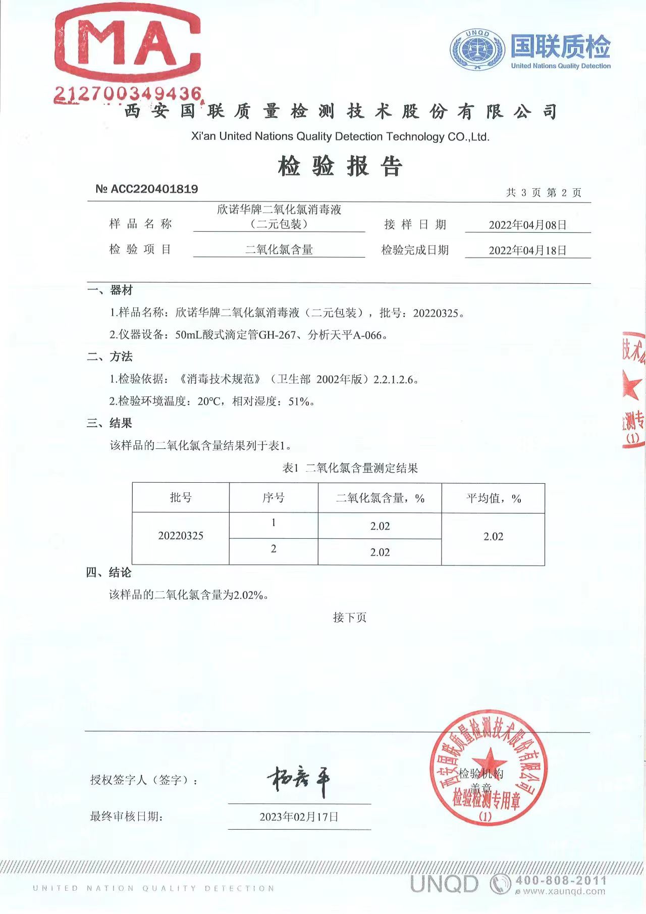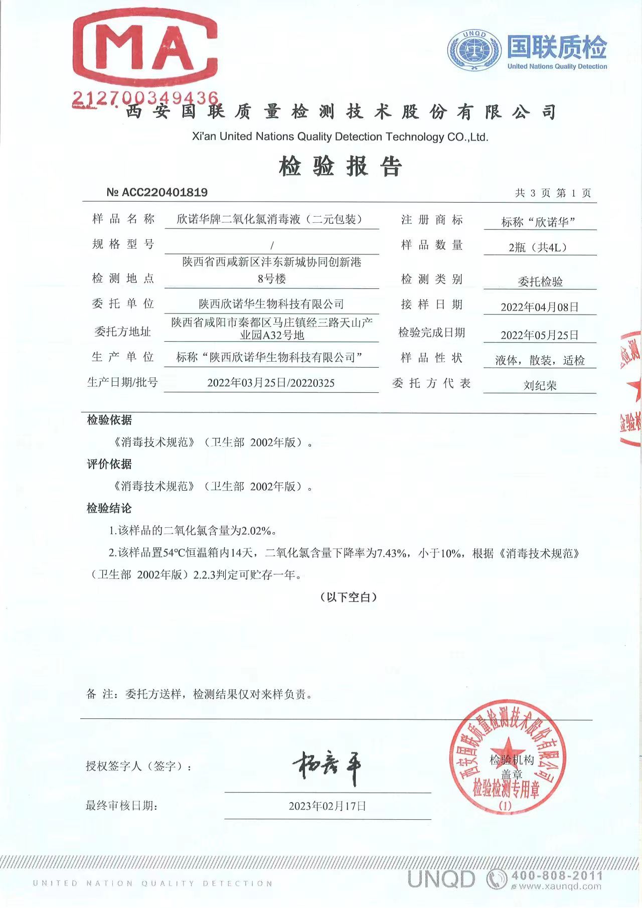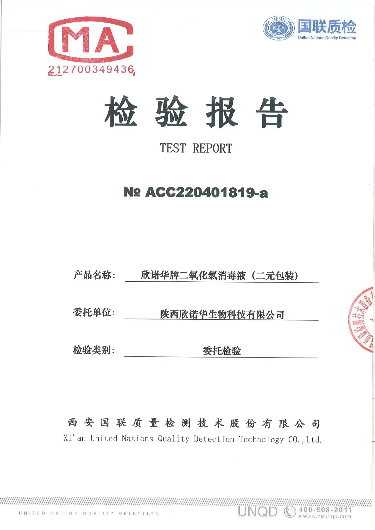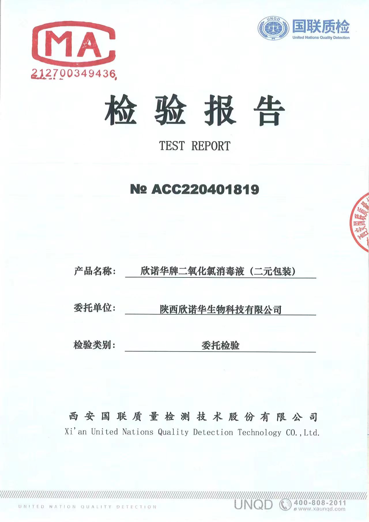二氧化氯消毒液(商品名稱:欣諾華牌二氧化氯消毒液)第三方檢測報告,本品是以二氧化氯為主要有效成分的消毒液,主要用于生活飲用水消毒,二次供水消毒。含量:2.0%,生產(chǎn)商;陜西欣諾華生物科技有限公司,服務(wù)熱線:13991111706(微信同號)
