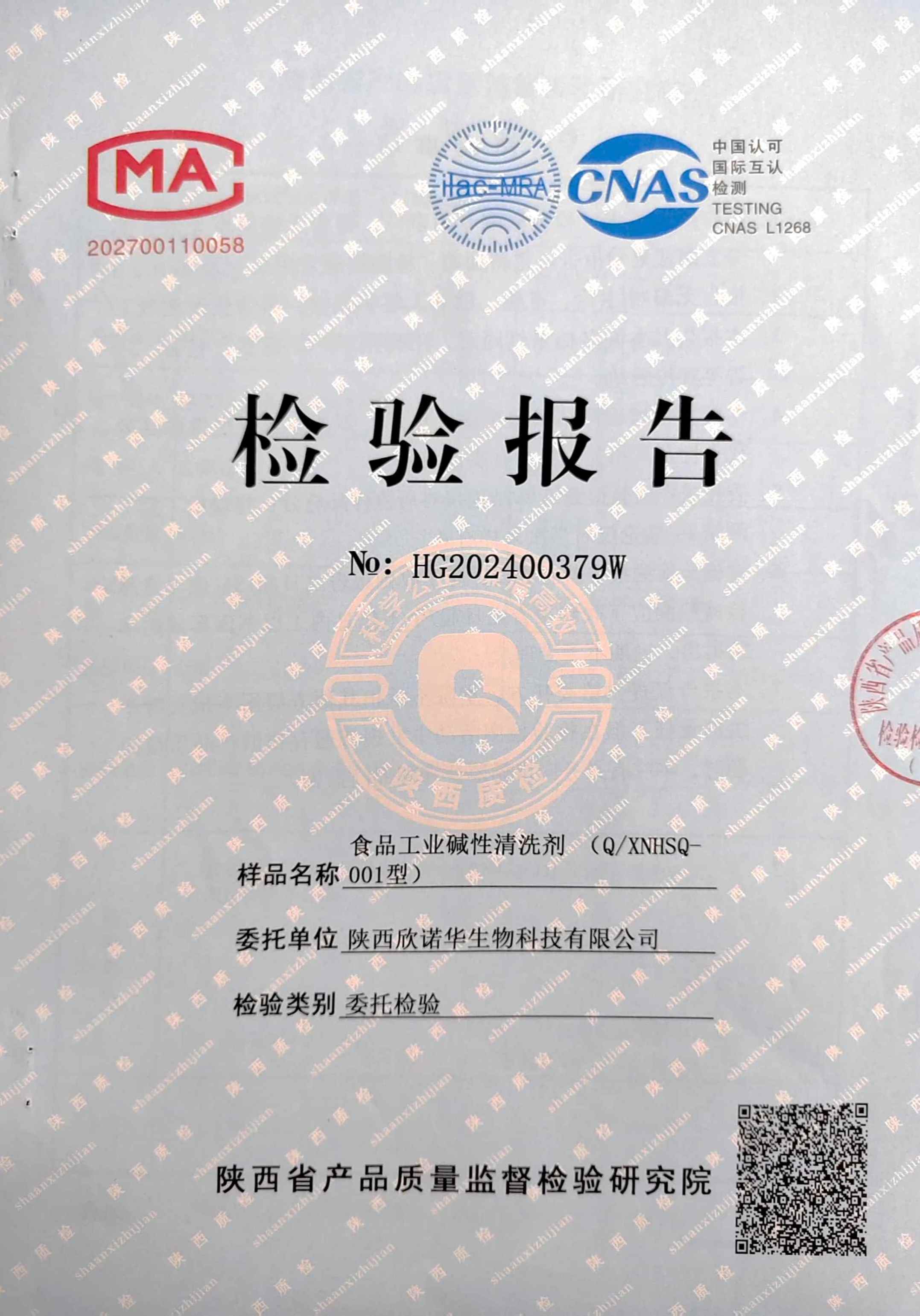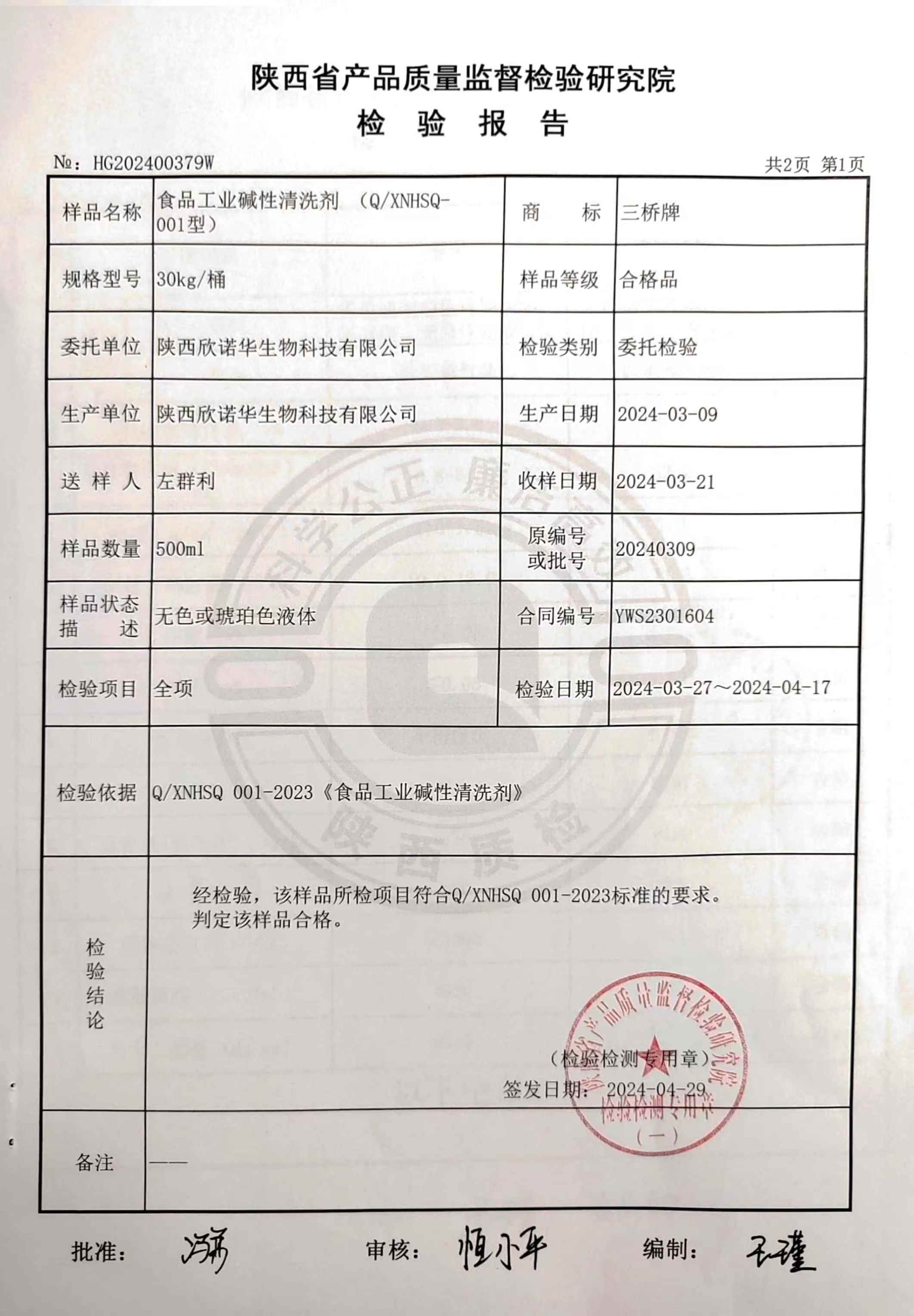 三橋牌食品工業(yè)堿性清洗劑檢測報(bào)告(2024年度)-陜西欣諾華生物科技有限公司
