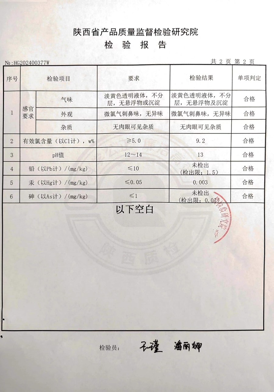 欣諾華牌食品級(jí)次氯酸鈉消毒劑檢測(cè)報(bào)告(XNH303型)(2024年度)-陜西欣諾華生物科技有限公司