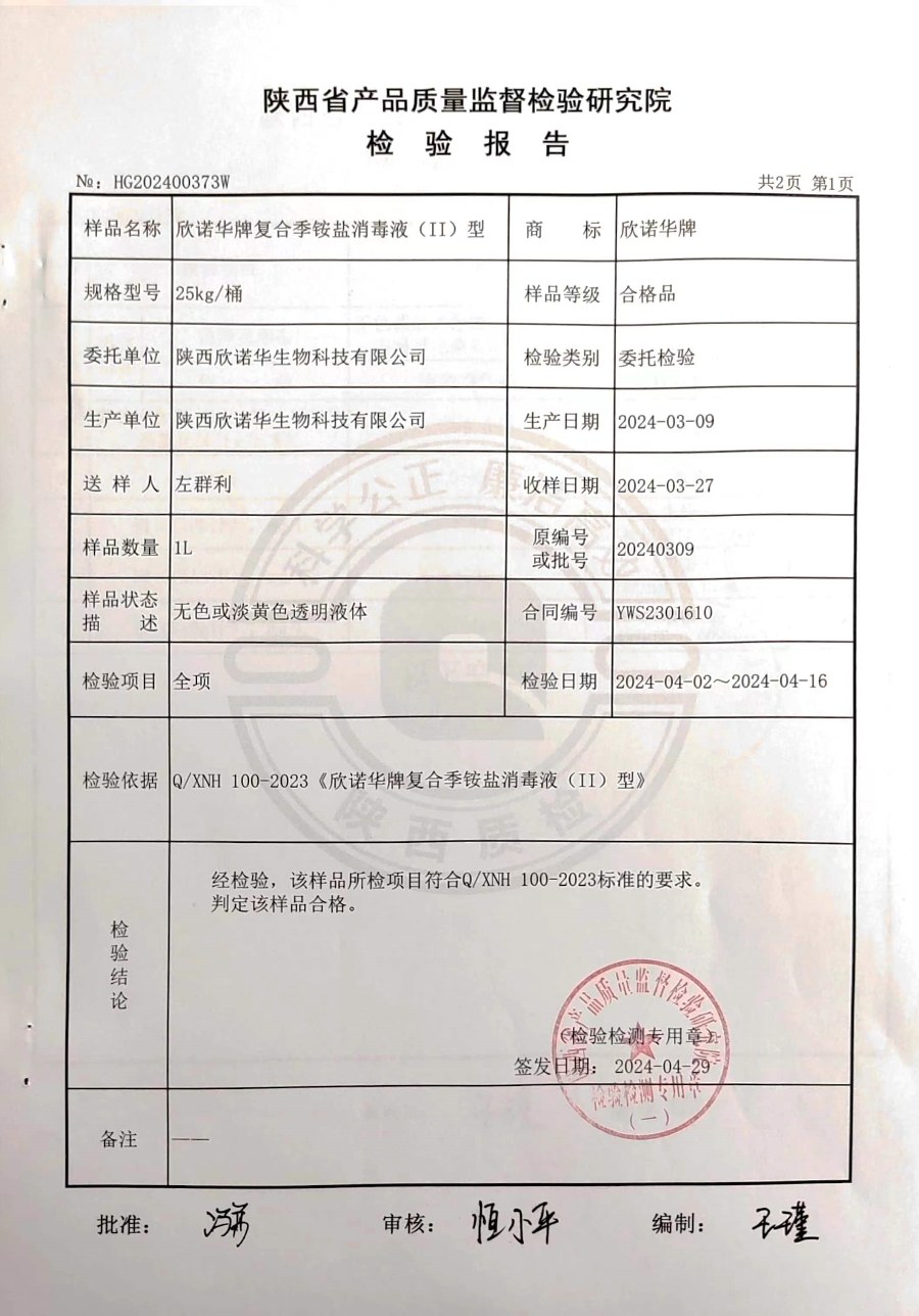 欣諾華牌復(fù)合季銨鹽消毒液檢測報告(2024年度)-陜西欣諾華生物科技有限公司